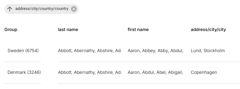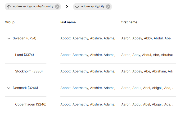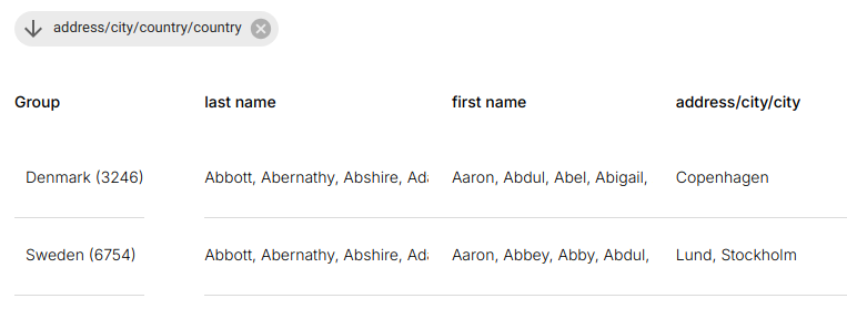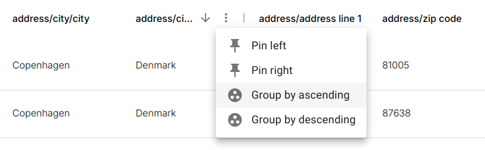 • Group Ascending / Descending Moves the column into the grouping layer and applies hierarchical aggregation.