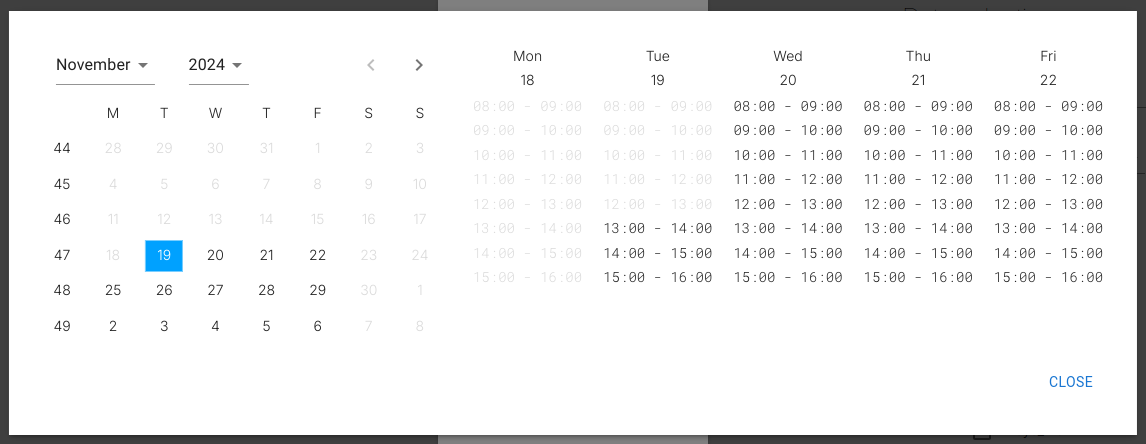 For example, a rule may prevent overlapping bookings. In the UI below, the slot from 12:00–13:00 is missing because it overlaps an existing booking: