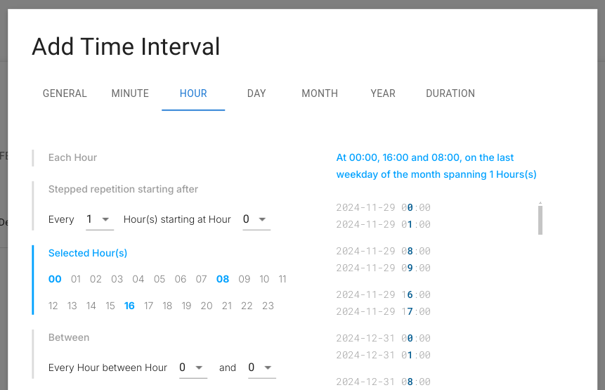 The configuration is done through an intuitive graphical interface without requiring knowledge of scheduling expressions. Users define repetition using five tabs—Minute, Hour, Day, Month, and Year—to construct precise recurrence rules. Only one selection per tab can be active at a time.