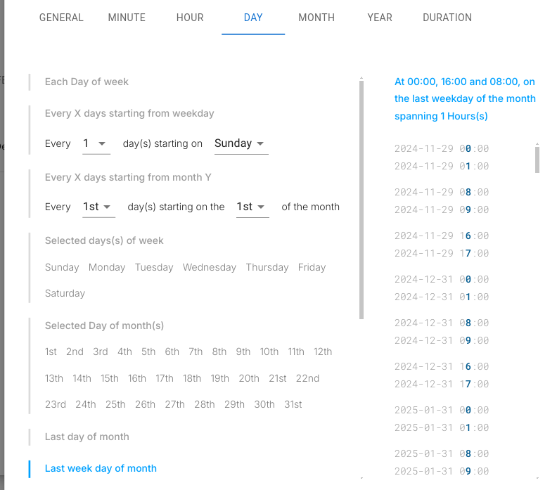 The configuration is done through an intuitive graphical interface without requiring knowledge of scheduling expressions. Users define repetition using five tabs—Minute, Hour, Day, Month, and Year—to construct precise recurrence rules. Only one selection per tab can be active at a time.